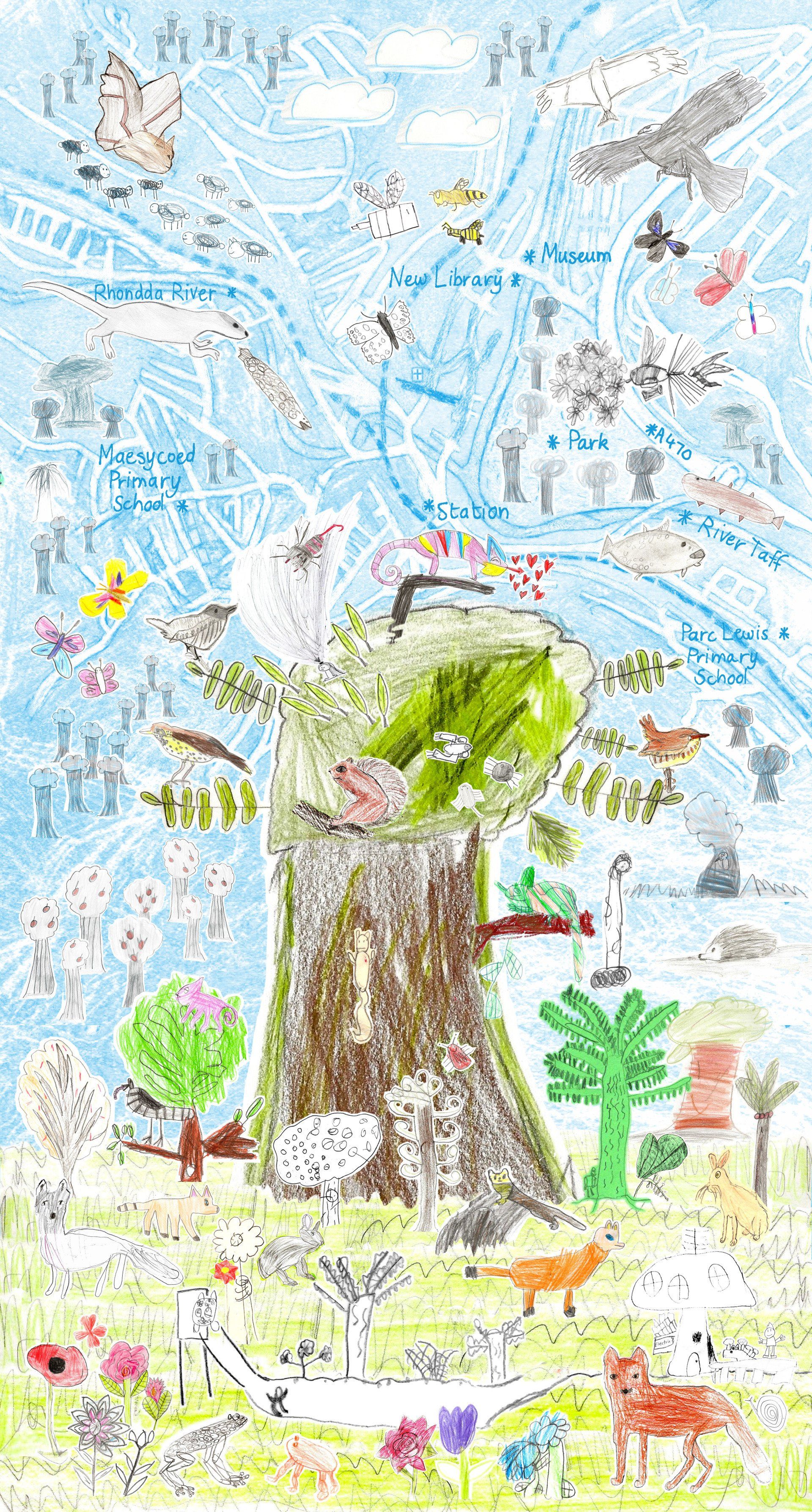 Pupils of Maesycoed Primary School (Maes Y Coed - The Field of Trees) and Young Friends of the Earth, worked with artist Anne-Mie Melis to explore ideas around biodiversity and how all living things are connected. In 100 years time what will nature look like, what plants and species will there be?